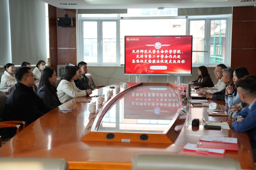 学院党委副书记、纪委书记史晓晨深情回顾了在二中读书的青春岁月,介绍了生命科学学院在学科建设、师资培养等方面的优势,希望通过课程共建、实践基地共享等方式,为大学生搭建更优质的教育实践平台,为中学生拓展更广阔的成长空间。石婕书记对二中近年来取得的办学成果给予高度评价,表示将联合建设研学实践基地,为大学生打造优质教育实践平台,为中学生开拓科研启蒙通道。未来将通过党建引领、学术协同、资源共享,构建学科与就业实习发展共同体。特别强调要发挥学院在生物学前沿研究、师范生培养方面的优势,助力中学打造一流核心课程和师资团队。会上,beat365中文版官方网站生命科学学院党委书记石婕与天津二中校长高欣共同签署战略合作协议。