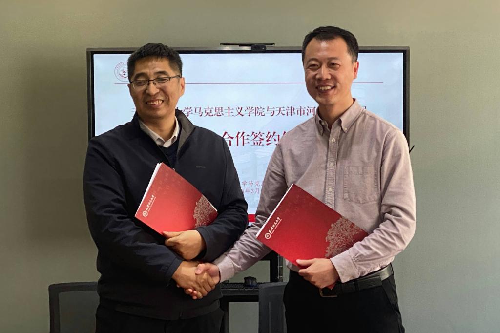 本站讯(通讯员 金明昊)日前,天津市河北区教育局、教师发展中心负责同志一行莅临马克思主义学院,开展共建签约活动。河北区教育局副局长张海波、学管科科长杨芳、教师发展中心主任段崇伟、副主任何洁,大思政工作室主持人以及育婴里小学等部分中小学负责同志、教师代表,与马克思主义学院党委书记郭尚维,常务副院长李朝阳,院党委副书记、纪委书记张素玲,副院长王雪超及各教研室主任、教师代表共计30余人参加。签约仪式由马克思主义学院党委书记郭尚维主持。