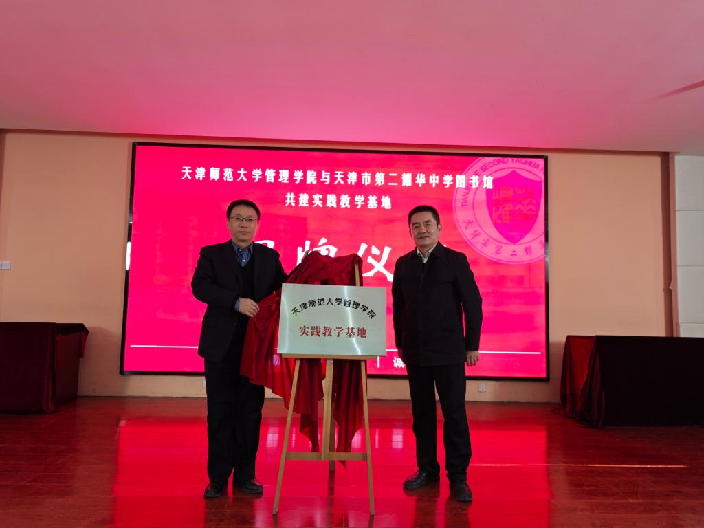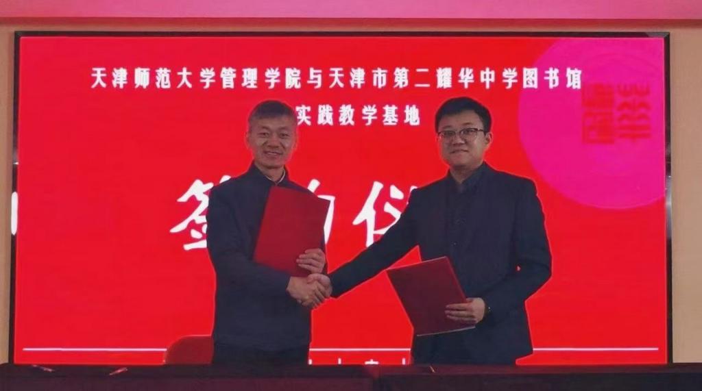 本站讯(通讯员 时晟蓉)12月27日,beat365中文版官方网站管理学院与天津第二耀华中学图书馆共建“实践教学基地”揭牌仪式在第二耀华中学举行。管理学院院长刘冰、副院长翟羽佳、信息资源管理系教师何颖芳和于斌斌,天津市第二耀华中学党委书记刘庆祝、党委副书记、校长冯耀忠以及其他校领导、师生等共同出席揭牌仪式。国家图书馆出版社图书馆学编辑室主任邓咏秋、清华大学图书馆信息参考部副主任王媛、天津市耀华中学党办主任、图书馆馆长钟伟、天津教育报刊社刘炘受邀参加。