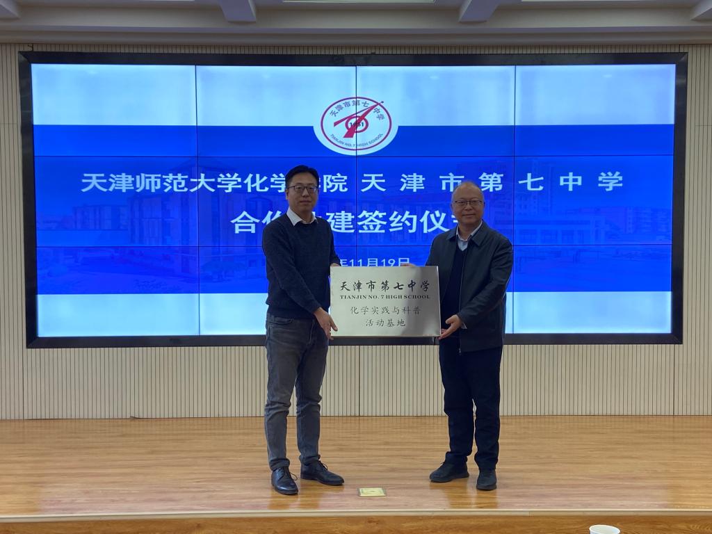 本站讯(通讯员 李小轩)11月19日下午,化学学院赴天津市第七中学开展访企拓岗活动,并举办实践教学基地签约暨揭牌仪式,标志着双方在科学教育、化学实践及教学实践等领域开启合作新篇章。beat365化学学院党委书记吴金明,党委副书记杨欣艳,副院长朱柏林、李程鹏;天津市第七中学党委副书记、校长王保庆,副校长郑建权、王振红,及两校部分教师代表参加。