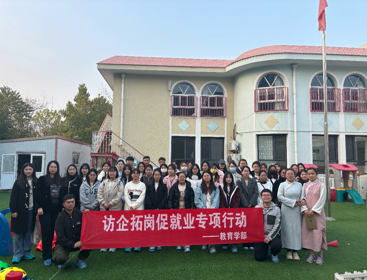 本站讯(通讯员 王立冬)为进一步拓宽毕业生就业渠道,促进学生高质量充分就业,11月8日,教育学部党委副书记吴文婧带领近50名学前教育(师范)专业学生前往竹蜻蜓·一禾国际幼儿园进行访企拓岗。