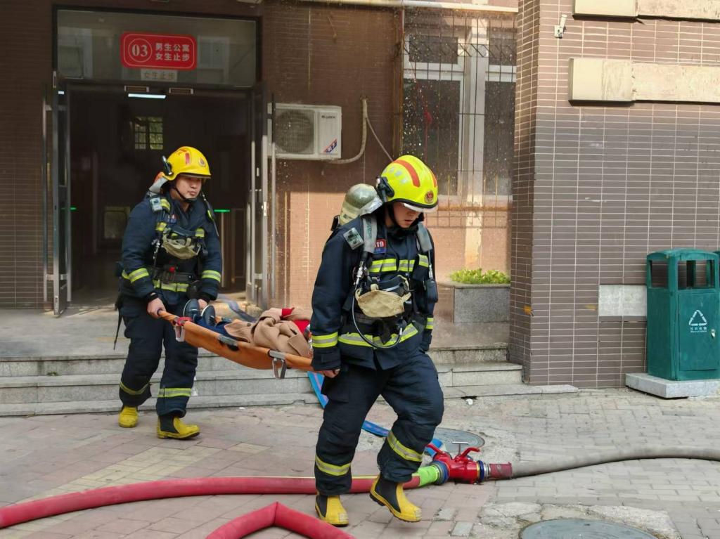 下午13时演练正式开始,烟雾施放组在既定位置点燃烟弹模拟火场,公寓楼前冒起滚滚“浓烟”。发现确认火情后现场人员 “拨打”119火警电话,并通过校内报警电话报告学校立即启动应急疏散预案。疏散组协同公寓管理员迅速引导参演学生俯身低姿穿过“烟雾”疏散至安全区域,灭火救援组进入楼内扑救初起火灾,西青区消防救援支队接报后迅速到场展开“灭火”救援,救出“被困”学生。整个疏散过程紧张有序,经过各学院负责老师详细清点人数,确认疏散过程中无一学生遗留在宿舍,全部安全快速到达指定地点,演练过程达到预期效果。