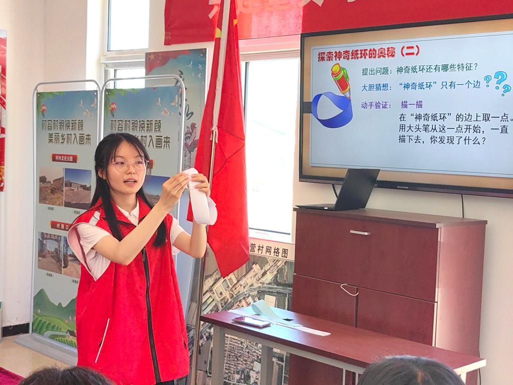 在王口镇南万营村,实践团成员面向中小学生、成年人及老党员等群体,开展了形式多样的科普宣讲活动。他们结合数学专业优势,充分发挥师范专业特长,通过航模讲解与展示、莫比乌斯带数学科普等趣味活动,激发学生对科学和数学的学习兴趣,传播科学教育理念与跨学科教育观念,为乡村教育振兴注入新活力。