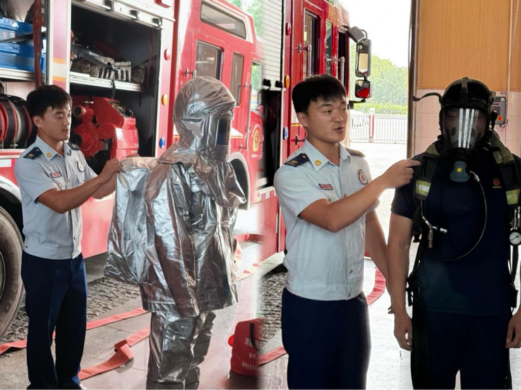 消防官兵展示了接到火警一分钟之内从滑杆直接下到一楼,并穿戴好防护服和备齐设备。学生试穿了救援服,试戴了氧气面罩及试背氧气瓶,通过切身体验感受到了装备的重量。参与试穿救援服的邵仕川同学谈道:“通过这次活动,我深刻认识到了消防员的辛勤工作和他们平时所承担的重大责任。”接着,学生们排成队伍,逐一拿起高压水枪。在专业消防员的指导下,他们学会了正确握持水枪、调节水流,并亲身体验了高压水枪的威力。