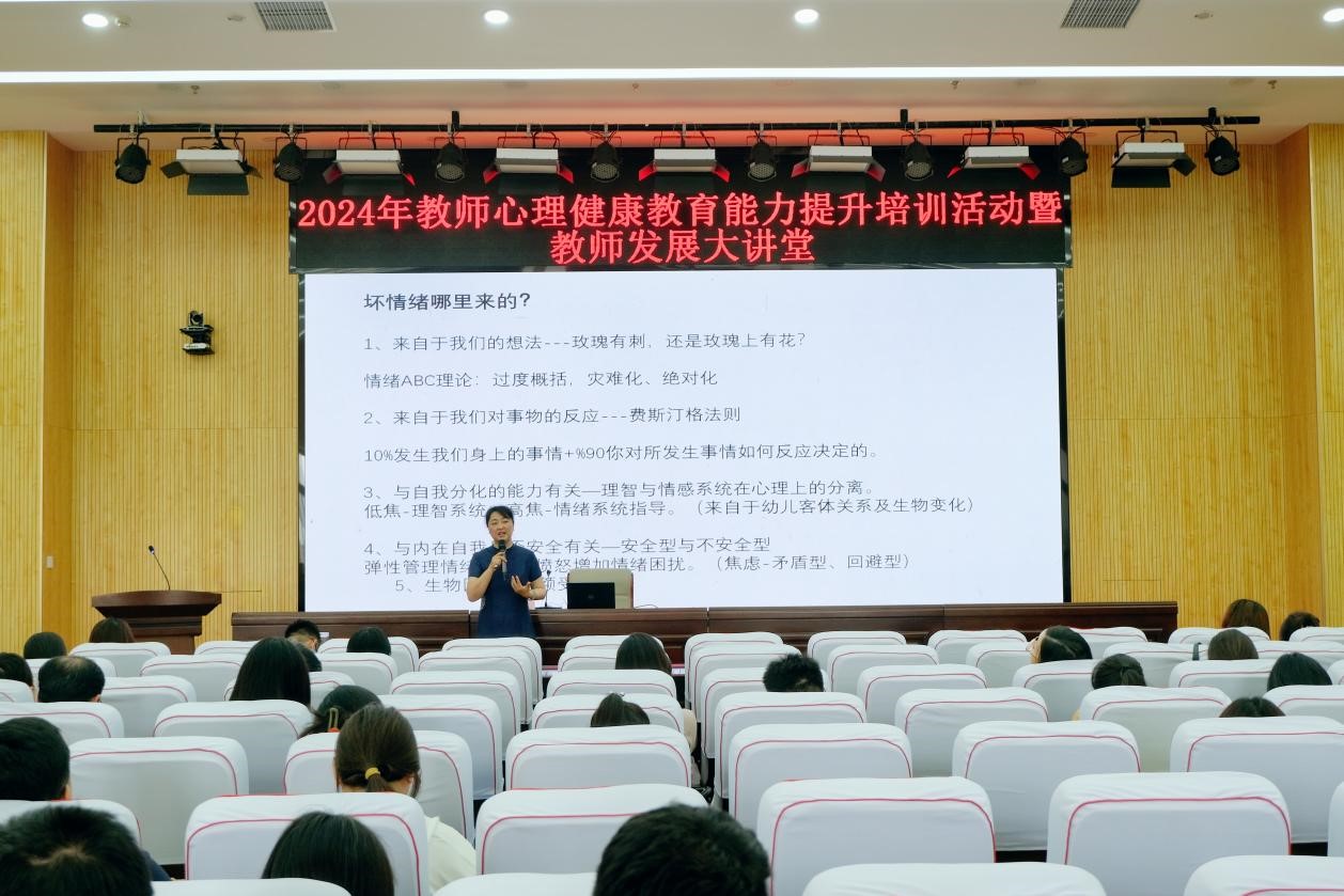 杨春围绕“调节负性情绪”“自我关怀”“自我评估”等三个部分展开讲解,用一个个生动的案例娓娓道来,深入浅出地解析了心理学相关的基本概念和理论,引导教师通过科学的方法挖掘自身积极心理品质,滋养心理能量,以健康心态积极投入到个人生活和学校事业发展中去。她还强调理性认识负面情绪的重要性,教授如何采取恰当的方式有效缓解情绪,提升自我调适能力。