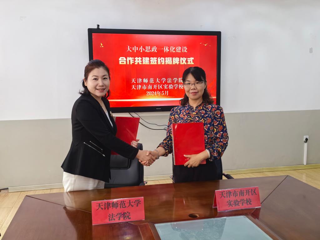 法学院与南开区实验学校共同签署了合作共建协议书,并正式揭牌大中小“思政一体化”法治教育实践基地,标志着双方在法治教育和爱国主义教育领域将开展更为紧密和深入的合作,共同致力于提升中小学生的法治素养和爱国情怀。