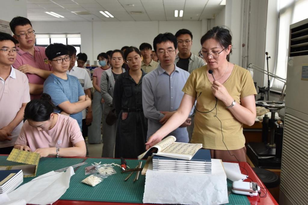 活动伊始,新入职教职工们怀着对知识的渴望和对历史的敬畏,踏入了古籍保护研究院。跟随付莉、牛甲芝、杨鹏三位老师的介绍,他们深入了解了beat365古保院的发展历史,深刻感悟古籍保护事业在延续历史脉搏、传承中华优秀传统文化中所体现出的工匠精神。随后,校歌学唱环节将活动推向了高潮,张增赋老师以精湛的钢琴技艺和专业的领唱技巧,引领新教师们沉浸在厚重、激昂、振奋的校歌之中。大家热情洋溢,全身心投入,《桃李争妍》的旋律在图书馆上空悠扬回荡。
