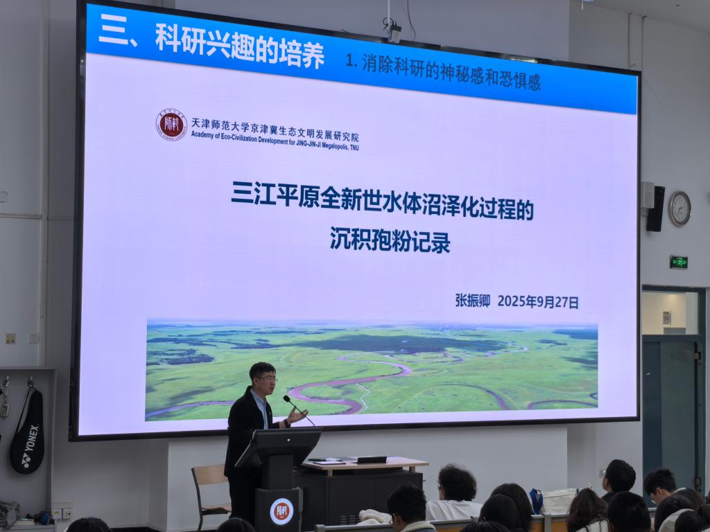 本次讲座的核心亮点在于将“科研”的概念,提前引入新生的视野。“科研不是大三大四学生的专利,大一是播下科研种子的最佳时机。”张振卿老师以亲身经历,总结了地理学两大魅力:一是田野工作的乐趣,在采样中亲身感受自然与人文;二是科研工作的成就,其成果能够服务社会、为国争光,创造实实在在的价值。他以塔克拉玛干沙漠形成时间、三江平原沼泽湿地演化等研究为例,拆解科研思路与方法,强调科研并非晦涩难懂,打消新生对科研的“神秘感”,鼓励新生增强科研信心。