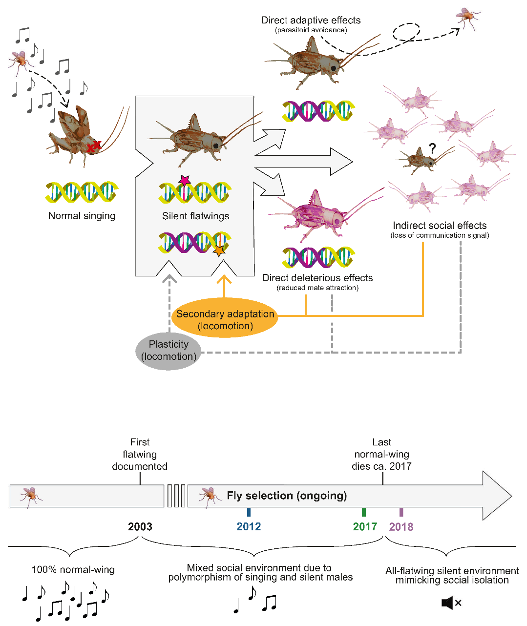 图1 | 描述夏威夷“不会叫”的蟋蟀补偿性基因组协同适应的概念图(上图)及描述夏威夷蟋蟀群体主要社会环境转变的时间线(上图)