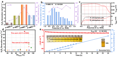 开发的富吡咯氮掺杂的石墨烯介孔碳复合材料表现出极佳的2e−-ORR性能,在−0.6 V vs. RHE的测试电位下,达到30 mol g−1 h−1的H2O2产率,同时表现出80%的法拉第效率。24h的长时长测试可以积累得到7.2 g L−1的H2O2(图1)。理论结果表明:双吡咯氮活性中心比石墨氮、吡啶氮和单吡咯氮相比会具有更小的反应过电位。而双吡咯氮活性中心的两电子反应能垒远低于四电子反应,从而表现出更高的催化性能。